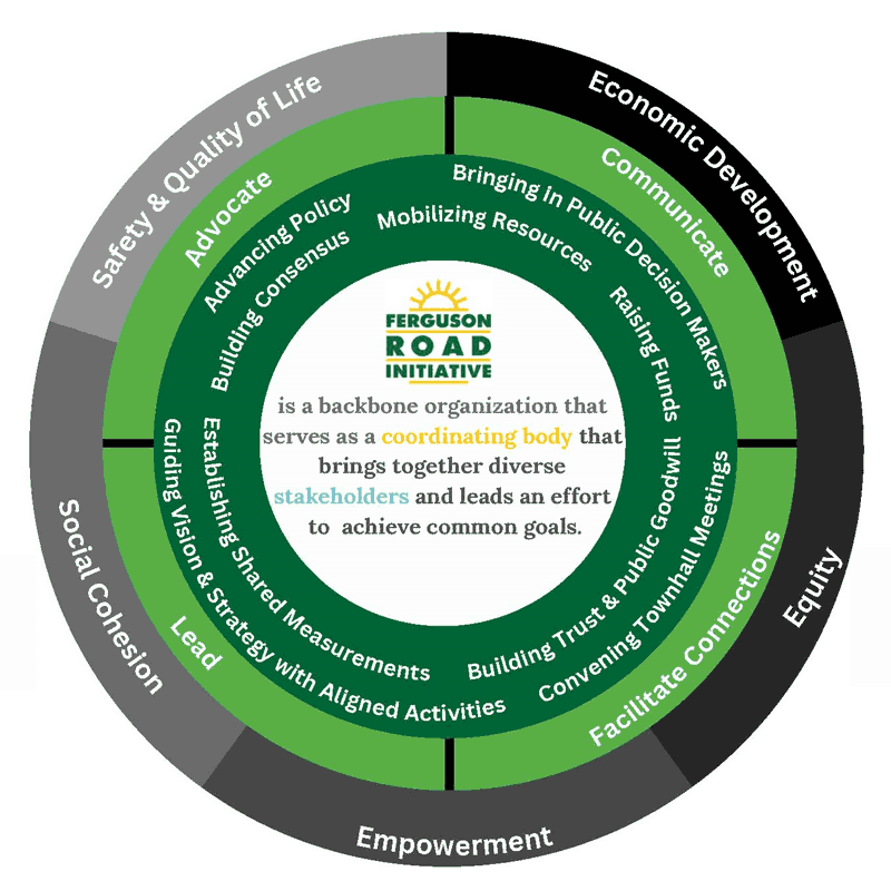The light green circle identifies the four actions FRI takes: FRI advocates, communicates, facilitates connections, and leads the community of Far East Dallas to improve safety & quality of life, economic development, equity, empowerment, and social cohesion (shown in the outer gray/black circle).