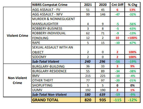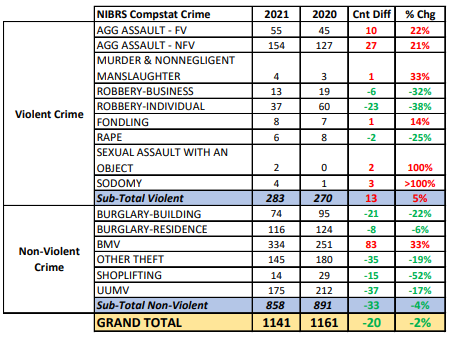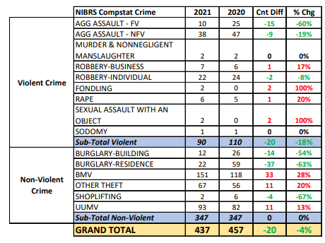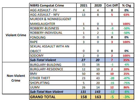 Crime Statistics, Year-to-Date (2020 to 2021) for the Four Areas Served By The Ferguson Road Initiative. They are put in context by Officer Theron Akin in the Community Connection Town Hall Meeting video (go to approx. 10:14 in the video).