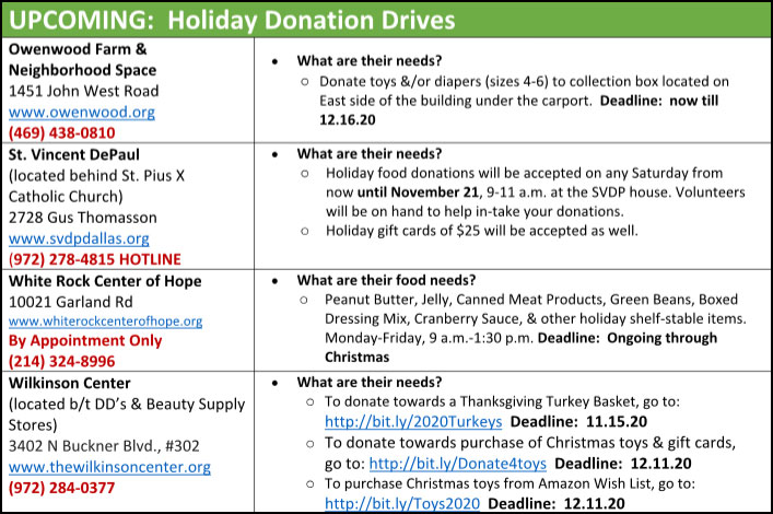 Holiday Food donations will be accepted at St. Vincent De Paul, 2728 Gus Thomasson Road 9-11 a.m. on the following dates: