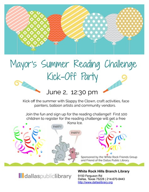 Join the White Rock Hills Branch Library, 9150 Ferguson Road, on Saturday, June 2 at 12:30 p.m. for the Mayor’s Summer Reading Challenge Program. Come on, kids! Let’s kick off the summer with Slappy the Clown, face painting, and balloon artists as we celebrate your registration in the library’s summer reading program.