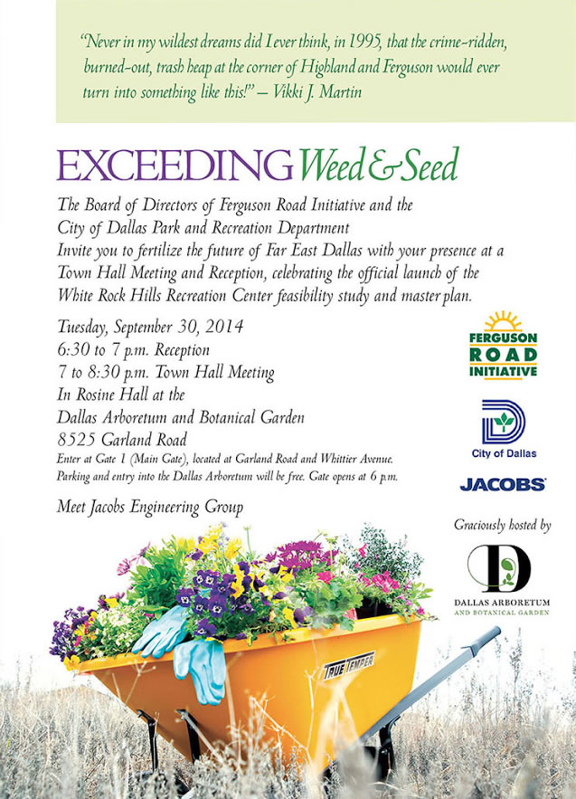 The Board of Directors of the Ferguson Road Initiative and the City of Dallas Park and Recreation Department invite you to fertilize the future of Far East Dallas with your presence at a Town Hall Meeting and Reception, celebrating the official launch of the White Rock Hills Recreation Center feasibility study and master plan.