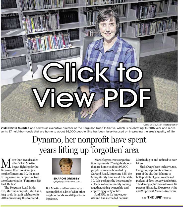 If you appreciate the enhancements that Ferguson Road Initiative has brought to our neighborhoods, then you appreciate Vikki Martin. As the Executive Director and founder of FRI, Vikki has worked tirelessly on our behalf through the last two decades. Dallas Morning News editorial writer Sharon Grigsby has penned an article that honors Vikki Martin and draws attention to the excellent work of Ferguson Road Initiative. Click the thumbnail below to view a PDF of the article.