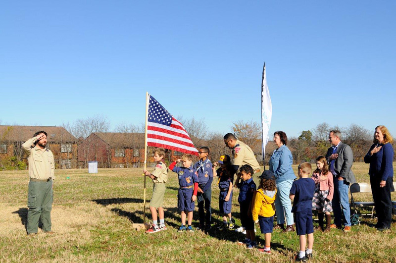 Boy Scouts members from Troops 16 & 83 served as color guard and opened the event with the Pledge of Allegiance, as Vikki Martin, Councilman Clayton and Park Board rep. Becky Rader look on